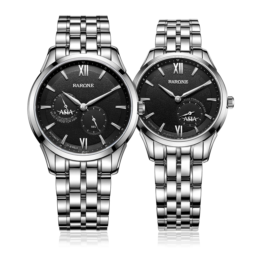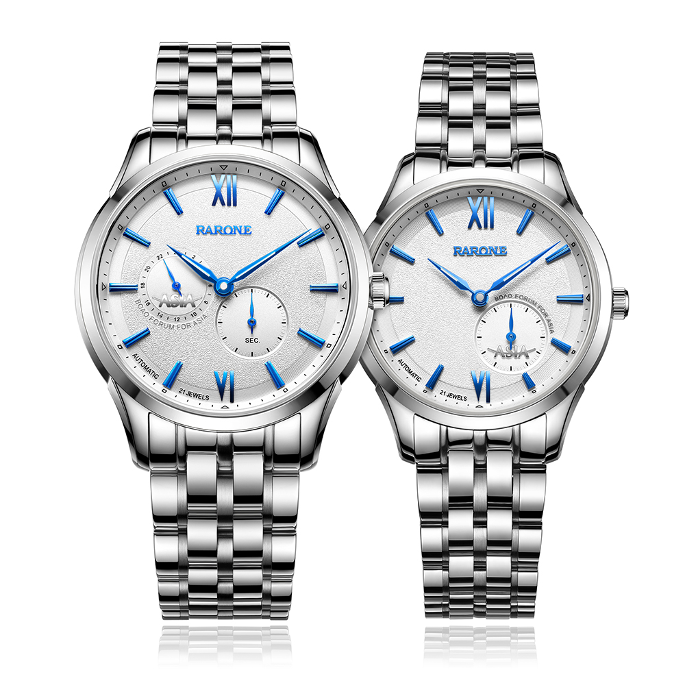 2016年新品以男女對(duì)表形式呈現(xiàn),搭載進(jìn)口全自動(dòng)機(jī)械機(jī)芯,透視底蓋清晰可見(jiàn)機(jī)芯運(yùn)作。男女表在設(shè)計(jì)細(xì)節(jié)上做了區(qū)別,更加匹配男女士對(duì)美的不同追求。除了經(jīng)典的黑色,間金色之外,新款首次采用鋼藍(lán)色表針和字釘,為商務(wù)用表融入活力元素,同時(shí)視覺(jué)上更加清爽。大兩針搭配60秒功能小眼顯示時(shí)間,為當(dāng)下手表的熱門設(shè)計(jì),男表9時(shí)位增加一個(gè)24小時(shí)功能小盤,方便知曉和調(diào)教多維度時(shí)間。表盤上的“ASIA”標(biāo)識(shí)體現(xiàn)腕表的身份和紀(jì)念價(jià)值。